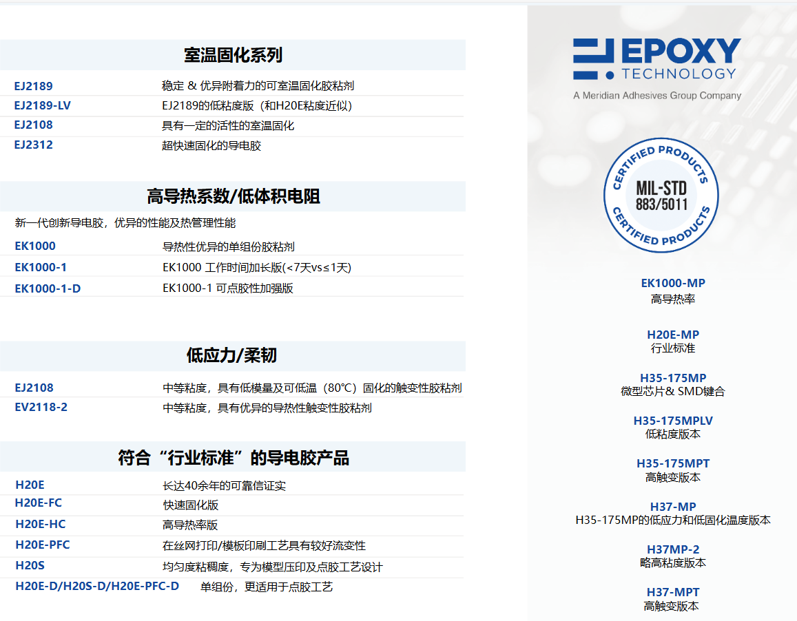 Epoxy Technology 提供各种导电和导热环氧树脂胶粘剂 (ECA)。我们丰富的产品线可供用户能根据不同的应用结合胶粘剂的物理,导电性,机械特点等性能,轻松地挑选出较好的胶粘剂以满足特殊的应用需求。